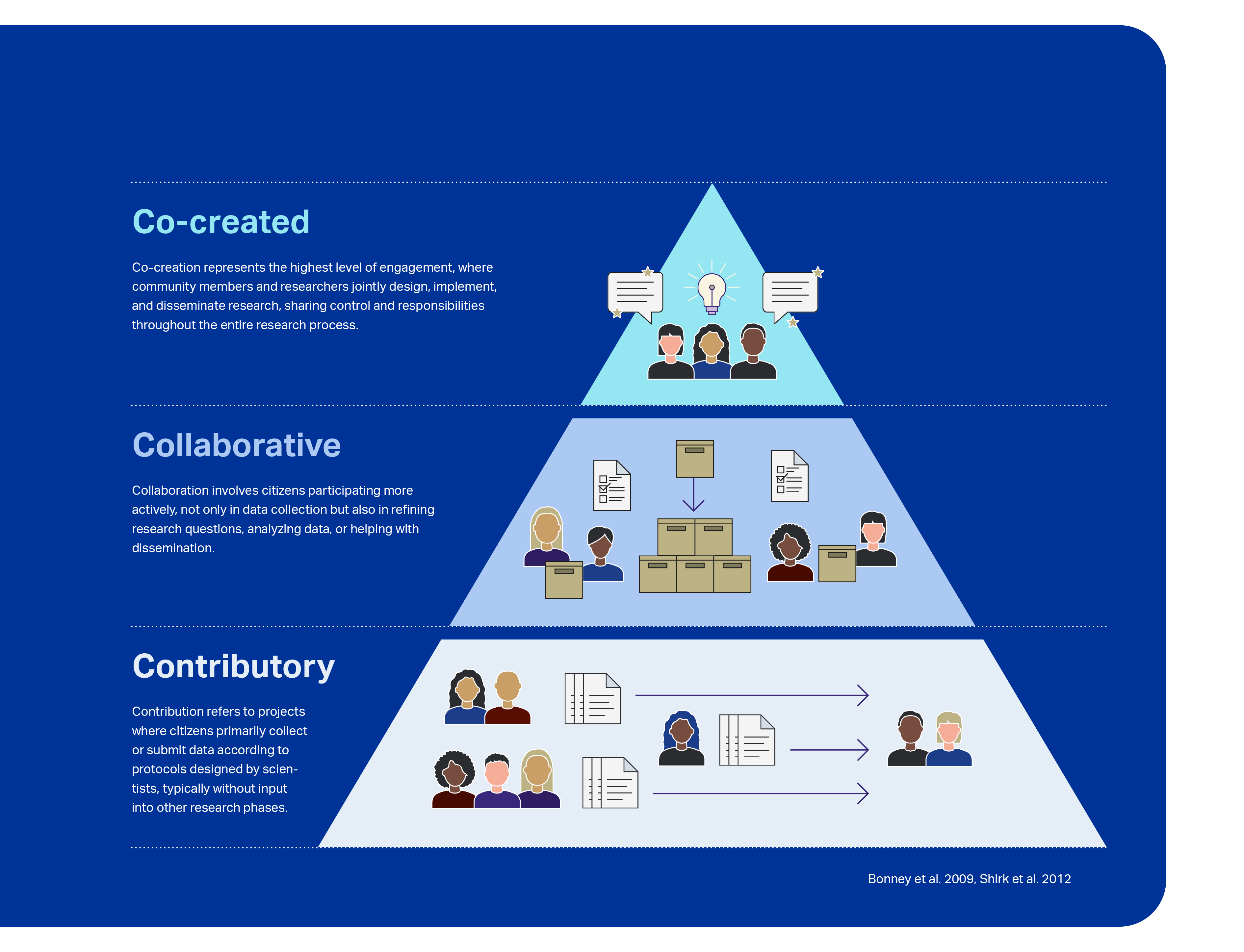 There are five key steps to the research process using Citizen Science and co-creation. Each step plays an important role in ensuring meaningful participation and effective results: